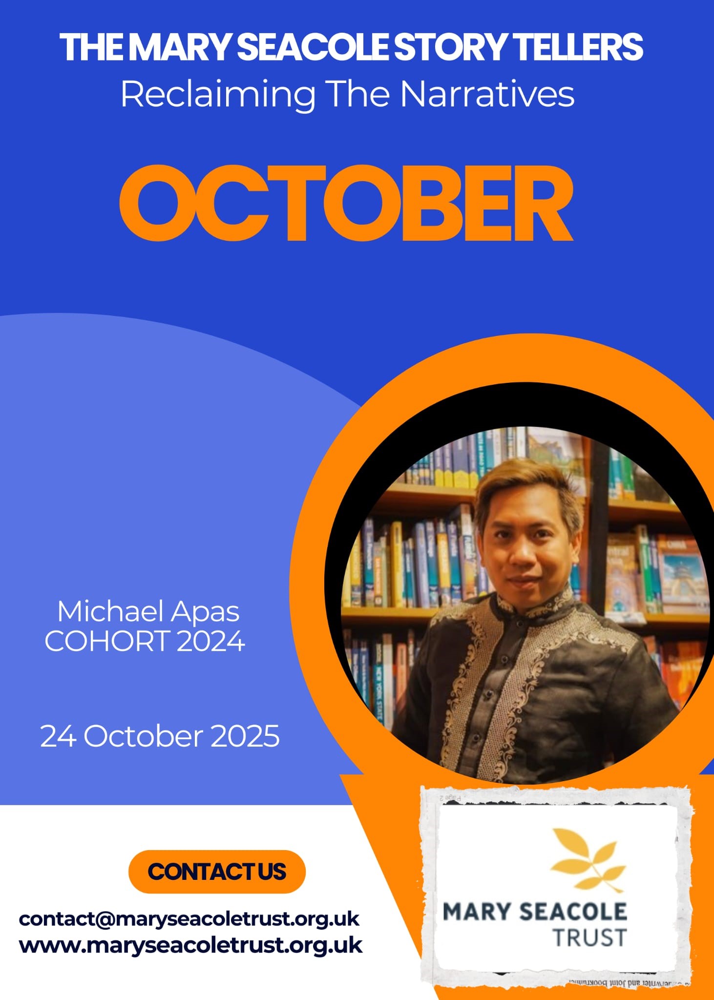 The next in the new monthly series by the Mary Seacole Storytellers will take place on Friday 24 October 2025 with Michael Apas from 6.00 PM – 7.00 PM.